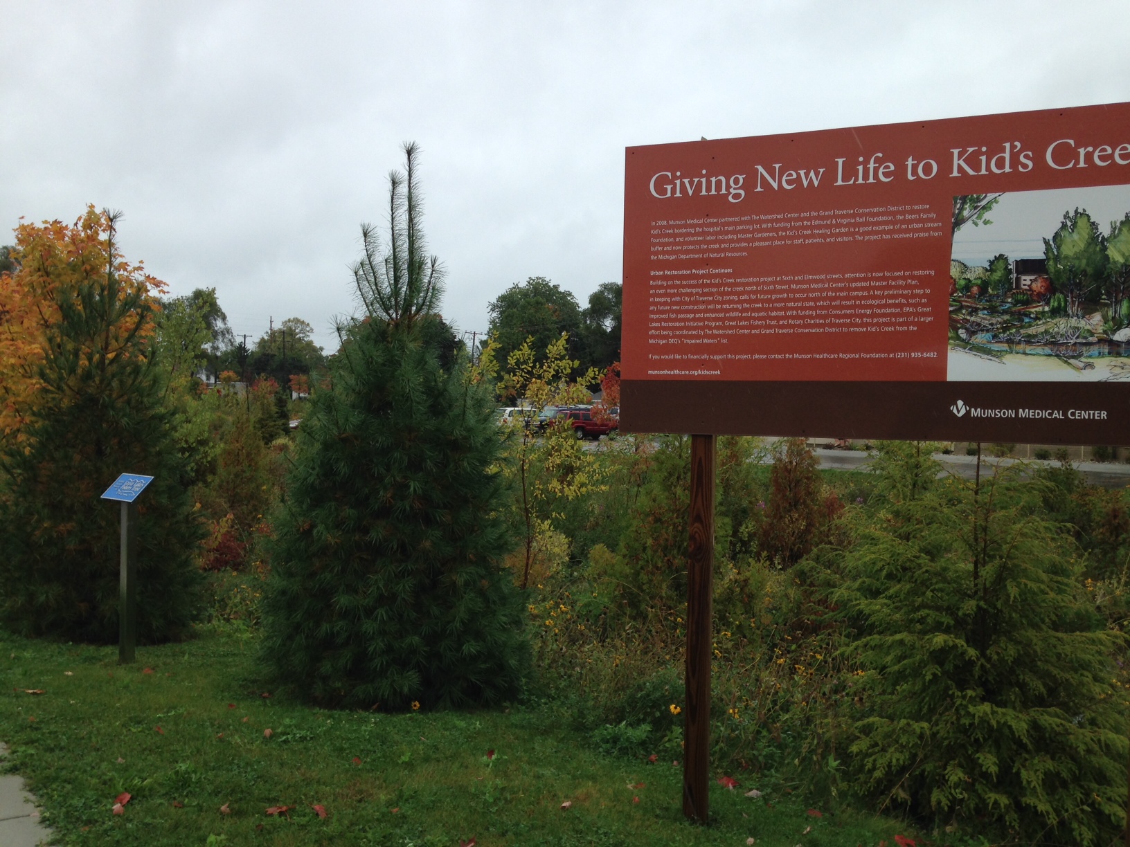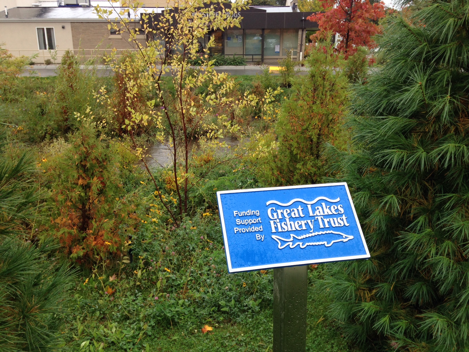 Funding support from the GLFT improved fish habitat and water quality on an impaired tributary to Kids Creek in the Grand Traverse Bay watershed. The Watershed Center worked with the Munson Medical Center to daylight a section of creek on the hospital's new Cancer Center campus by replacing underground culverts and channelized ditches with a natural meandering channel, replacing two street culverts with open bottom bridge structures, installing in-stream habitat and establishing a riparian buffer and floodplain.